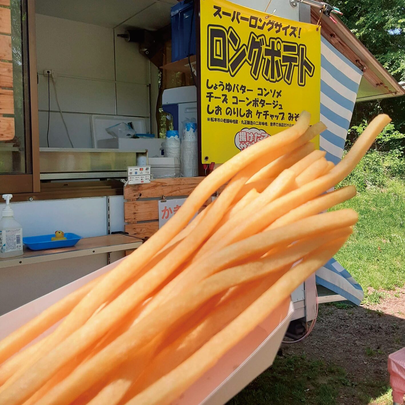 【ロングポテト】。年間3トン以上のポテトを揚げており、オキラク堂でしか食べること